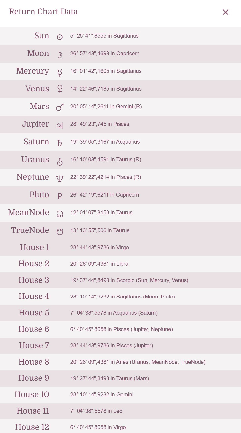 - Where a stellium of the Return map is within the Houses of the Return map.